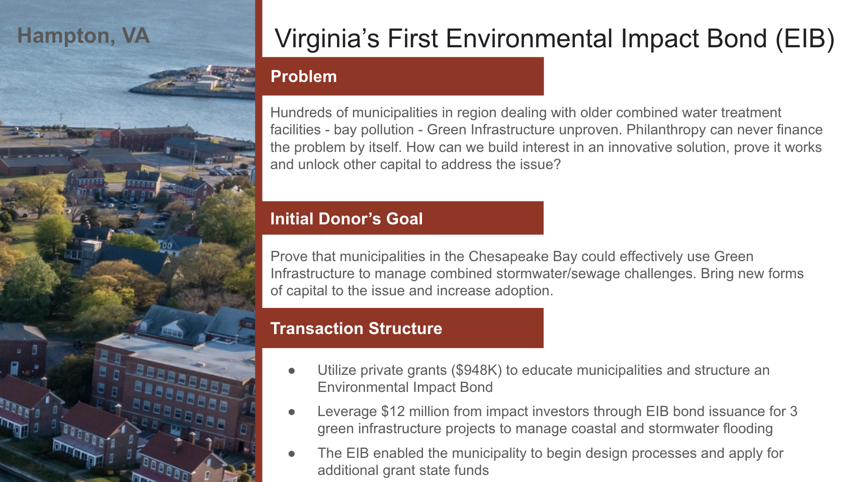 Problem we set out to solve: Hundreds of Chesapeake‑Bay municipalities rely on aging combined sewer systems that overflow during storms, polluting the bay; large‑scale green‑infrastructure solutions were still unproven, and philanthropy alone could never cover the price tag. The challenge was to spark interest in an innovative approach, prove it works, and unlock other capital to tackle the issue.